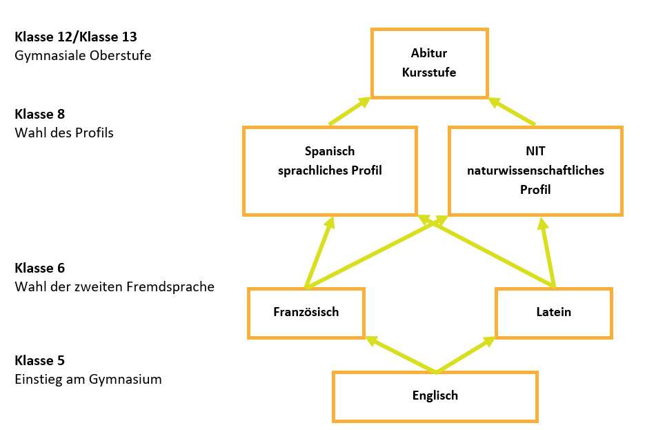 In Klasse 8 beginnt das Profilfach. An unserer Schule gibt es die Möglichkeit, zwischen dem sprachlichen Profil und dem naturwissenschaftlichen Profil zu wählen. Im sprachlichen Profil kommt Spanisch als dritte Fremdsprache hinzu, im naturwissenschaftlichen Profil das Fach NIT (Naturwissenschaft, Informatik und Technik)